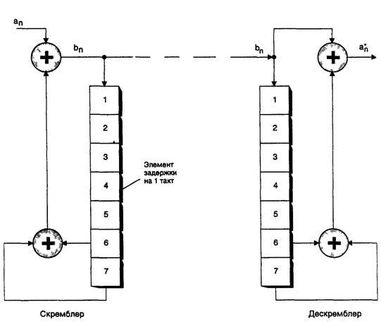 Недостатки, присущие самосинхронизирующим скремблеру-дескремблеру, практически отсутствуют при аддитивном скремблировании (рис. 2. 8).