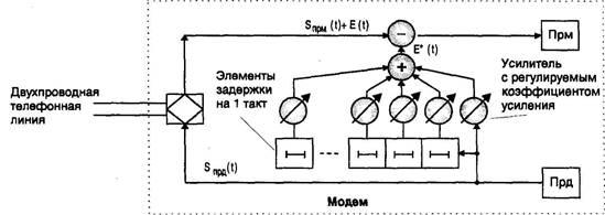 претерпевает существенные изменения вследствие амплитудных и фазовых искажений. На этапе установления соединения каждый модем посылает определенный зондирующий сигнал и определяет параметры эхо-отражения: время запаздывания, амплитудные и фазовые искажения, мощность отраженного сигнала. В процессе сеанса связи эхо-компенсатор модема вычитает из принимаемого входного сигнала свой собственный выходной E*