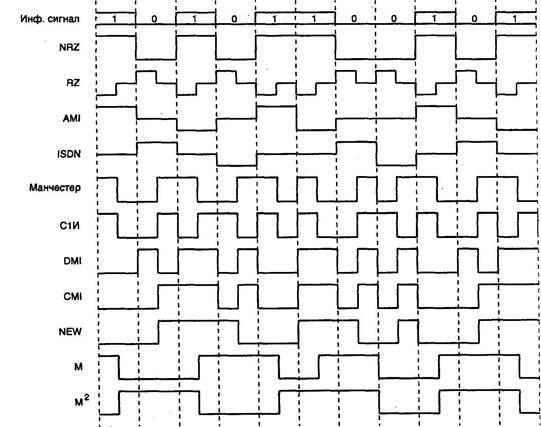 Различают неалфавитные (1В1Т) и алфавитные (mBnT) коды (В — двоичное, Т — троичное основание кода). При m>n скорость передачи снижается. Предельной помехоустойчивостью обладают сигналы, элементы которых равны, но противоположны по полярности. Примеры наиболее популярных линейных кодов приведены на рис. 2. 14.