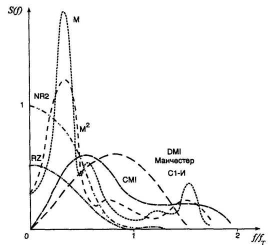—тактовая частота следования исходных двоичных символов. Эти спектры позволяют судить о частотной эффективности и свойствах синхронизации наиболее популярных линейных кодов.