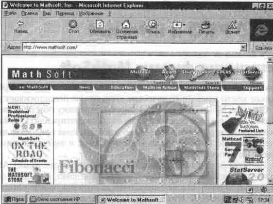 После того как основная страница браузера (она может быть разной у разных провайдеров сети Internet) будет выведена на экран, надо в поле адресов набрать адрес фирмы MathSoft, который был приведен выше. Нажав клавишу Enter, можно через короткий промежуток времени увидеть основную с границу фирмы MathSoft, показанную на рис. 15. 2. На этой странице, помимо рекламного изображения новой системы Fibonachi фирмы MathSoft, видны пиктограммы гипермедиа-ссылок и главное меню окна, также выполненное в виде этих ссылок. Активизируя их, можно путешествовать по довольно обширной странице фирмы MathSoft.