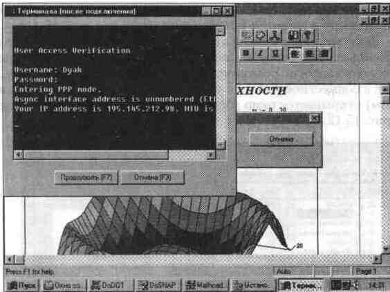 Если набор номера абонента прошел успешно, появляется темное окно терминала (см. рис. 15. 10). В этом окне надо повторить набор своего имени и пароля, нажимая в конце набора клавишу Enter. He исключено, что эту клавишу придется нажать два-три раза и для вывода сообщения о начале набора имени. Обратите внимание на то, что в ходе набора пароля вводимые символы не отображаются. Это сделано для того, чтобы находящиеся сзади вас люди не видели, какой пароль вы вводите.