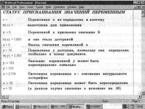 Пять последних переменных вводятся набором их имен. Значения системных переменных, как и обычных, могут быть в дальнейшем изменены путем присваивания им новых значений. К примеру, значение е