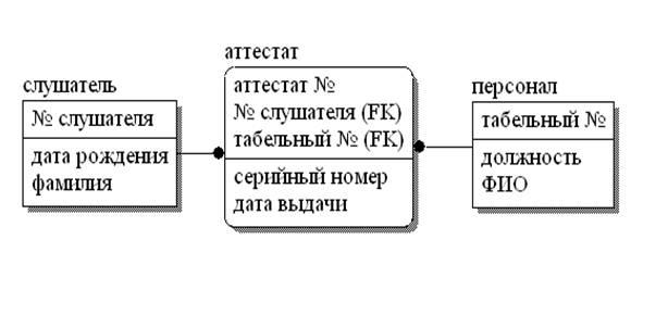 В сущности «Слушатель» 2 атрибута: «№ слушателя» и «Фамилия», причем «№ товара» является ключевым атрибутом. В сущности «Аттестат» ключевым атрибутом является «аттестат №», кроме него существует атрибут «Дата выдачи». В сущности «Персонал» 2 атрибут: