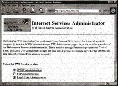 (Администрирование) имеется единственная кнопка (рис. 11.4); нажав, вы запустите инструмент администрирования Персонального Web-сервера, позволяющий осуществлять удаленное администрирование посредством Web-браузера.