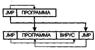 После загрузки зараженного файла управление получает вирус. Закон- чив работу, вирус восстанавливает оригинальный JMP и передает уп- равление программе, как показано на рис. 1.2.