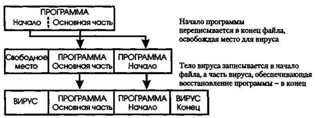 Существуют разновидности вирусов, не дописывающие часть своего тела в конец файла. К примеру, вирус может внедряться в середину файла. В этом случае алгоритм работы вируса является смесью алгорит- мов одного из двух только что описанных вирусов и вируса, описанно- го в разделе "Простейший СОМ-вирус".