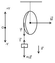 : Запишем уравнения движения грузов и блока в отдельности. Груз массой движется вниз поступательно с ускорением . На него действуют две силы: сила тяжести и сила натяжения нити . По второму закону Ньютона в векторной и скалярной формах с учетом выбранной системы координат