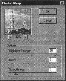 Значение поля Hightlight Strength (Подсветка) в диапазоне от 0 до 20 обеспечивает уровень белизны отражающих свет складок целлофановой пленки, значение поля Detail (Детализация) в диапазоне от 1 до 15 — количество этих складок, а в поле Smoothness (Смягчение) в диапазоне от 1 до 15 — степень мягкости игры света на складках.