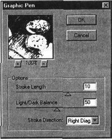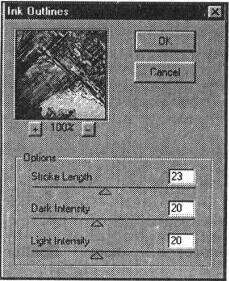 Значение поля Stroke Length (Длина штриха) определяет максимальную длину штриха в диапазоне от 0 до 40, а значение поля Stroke Detail (Детализация) в диапазоне от 1 до 20 — уровень детализации изображения.