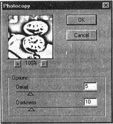 Фильтр Photocopy (Ксерокопия) служит для создания изображения, имитирующего оттиск на типичном дубликаторе (ксероксе и других подобных устройствах).