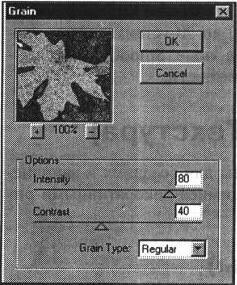 В списке Grain Type (Зерно) можно выбрать один из типов зерна: Regular (Стандартные), Soft (Мягкие), Sprinkles (Брызги), Crumple (Комки), Соп-trasty (Контрастные), Enlarged (Увеличенные), Stippled (Пунктирные), Horizontal (Горизонтальные), Vertical (Вертикальные), Specie (Пятна).