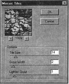 Значение поля Tile Size (Размер фрагментов) определяет величину изразцов в диапазоне от 2 до 100, а в поле Grout Width (Величина зазоров) в диапазоне от 1 до 15 — величину промежутков между ними.