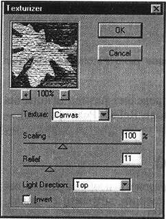 В списке Texture (Текстура) диалогового окна (рис. 12-56) можно выбрать «основу», на которую наносится изображение: Brick (Кирпич), Burlap (Мешковина), Canvas (Брезент), Sandstone (Известняк), а также с помощью варианта Load Texture... (Загрузить...) использовать другое изображение в формате программы Adobe Photoshop .PSD в качестве основы для текстуры. Масштаб текстуры определяется в поле Scaling (Масштаб) в диапазоне от 50% до 200%.
