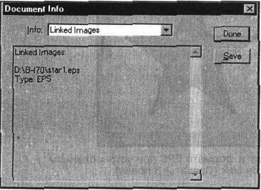 В частности, для того чтобы узнать местоположение связанных документов в указанных программах, имеется специальная команда Links (Связи), а в программе Adobe Illustrator необходимо использовать команду Document Info... (Информация о документе...), отображающей одноименное диалоговое окно (рис. 14-3) для вывода списка всех связанных документов с указанием их формата и местоположения или команду Selection Info... (Информация о выделенной области...) для отображения информации об одном выделенном изображении.