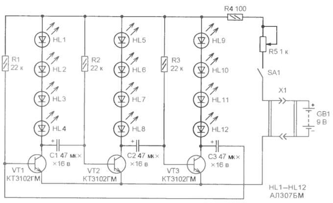Трехфазный мультивибратор собран на транзисторах VT1-VT3, в их коллекторные цепи включены светодиоды HL1-HL12, разделенные на три группы по четыре последовательно. Транзисторы поочередно открываются и включают соответствующие светодиоды.