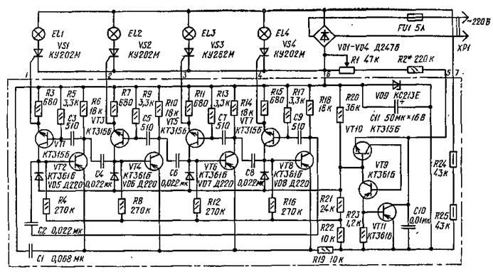 Рисунок 5 - Схема четырёхканального А.С.Э. на транзисторах.
