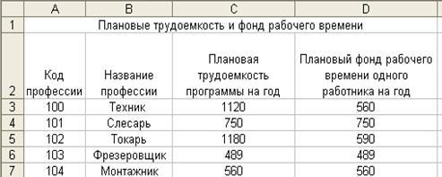 Вид таблицы «Плановые трудоемкость и фонд рабочего времени»