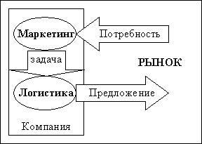 Маркетинг – вид экономической деятельности человека, направленный на удовлетворение нужд и потребностей путем обмена . Это определение верно для любой рыночно ориентированной компании. Таким образом, мнение, что маркетинг занимается «сбытом» и «исследованиями рынка» - это только одно направление деятельности маркетинговых подразделений. Вообще говоря, действия любого подразделения компании ориентированы на организацию или обеспечение внешних потребностей компании, основной из которых является обеспечение процесса сбыта продукции или услуг. Труднее дело обстоит с логистикой из-за отсутствия наиболее полного определения, поэтому примем наиболее общее определение, как «общая стратегия хозяйственной деятельности или стратегия оптимизации материальных и информационных потоков, необходимая для обеспечения конкурентоспособности компании». Таким образом, мы получаем самый главный вывод: логистика, являясь по сути одним из средств конкурентной борьбы и реализующаяся в зависимости от ситуации на рынке, даже организационно отделенная от маркетинговой деятельности по определению остается с маркетингом в теснейшей связке функционально. Изобразим описанные выше соображения в виде графической схемы.