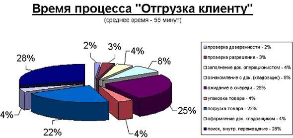 Оказалось, что при отгрузке товара клиентам (см. рис. 2), что занимает в среднем 55 минут, 25% времени процесса занимает ожидание в очереди и 28% - поиск товара при погрузке.