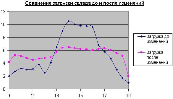 В тоже время, если посмотреть на график загрузки склада (см. рис.3), то станет очевидным крайняя неравномерность нагрузки. Это является с одной стороны следствием отсутствия регламента процессов в течение рабочего дня, а с другой стороны отсутствием напрашивающейся связи между складскими процессами и процессами поставок и продажи (или, другими словами, между подразделениями склада, поставок и сбыта).