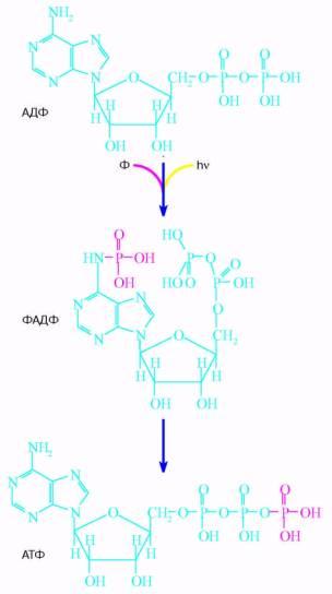 1) адениновая часть АДФ поглощает ультрафиолетовый квант, что переводит ее в возбужденное состояние с нарушенной системой двойных связей. При этом аминогруппа аденина, соответствующая в обычном состоянии ароматической, приобретает свойства алифатической, что облегчает ее электрофильную атаку атомом фосфора неорганического фосфата;