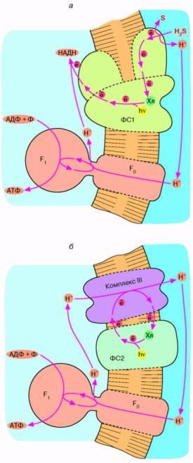 Рис. 5. Хлорофиллычый фотосинтез зеленых серных (а) и пурпурных (б)