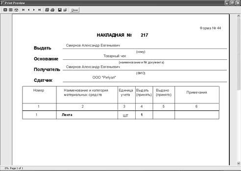 - вывод накладной на печать;