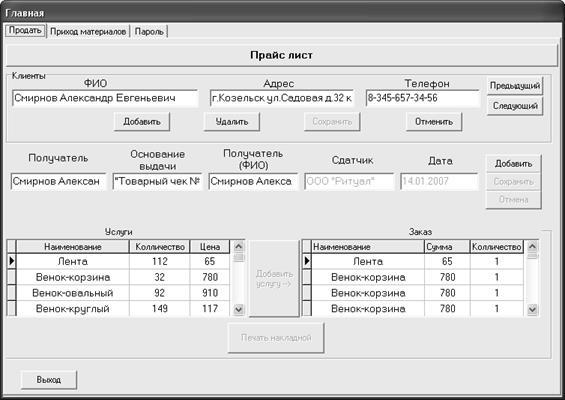 Здесь можно распечатать прайс-лист с информацией об услугах и ценах, так же на этой вкладке осуществляется управление клиентами фирмы, заполнение данных накладной, и регистрируется новый заказ.