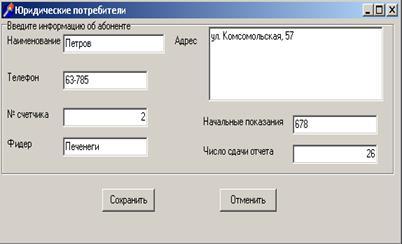Программа должна вести базу данных фидеров, базу данных юридических абонентов, учет потребления электроэнергии юридических абонентов, учет потребления электроэнергии бытовых абонентов. А также формировать отчеты расхода электроэнергии за месяц юридических абонентов, отчеты расхода и процент потерь электроэнергии за месяц на фидерах.