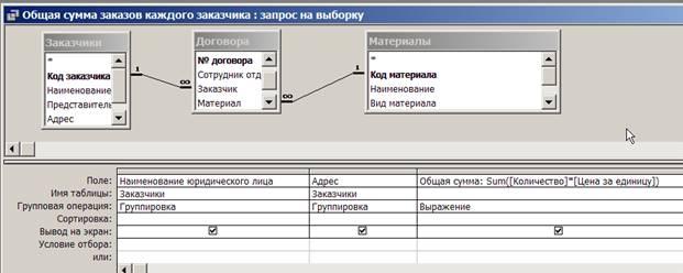 В качестве источника запроса выбираем таблицы «Договора», «Материалы» и «Заказчики» и перемещаем необходимые поля на рабочее поле, щелкая по ним левой кнопкой мыши.