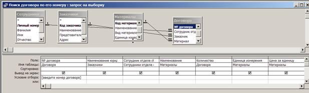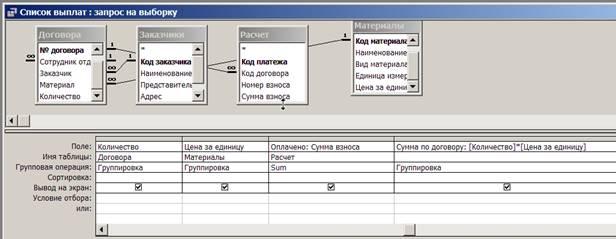 В качестве источника запроса выбираем таблицы «Договора», «Материалы», «Сотрудники отдела сбыта» и «Заказчики» и перемещаем необходимые поля на рабочее поле, щелкая по ним левой кнопкой мыши.