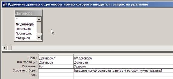 Создадим запрос «Удаление данных о договоре, номер которого вводится».