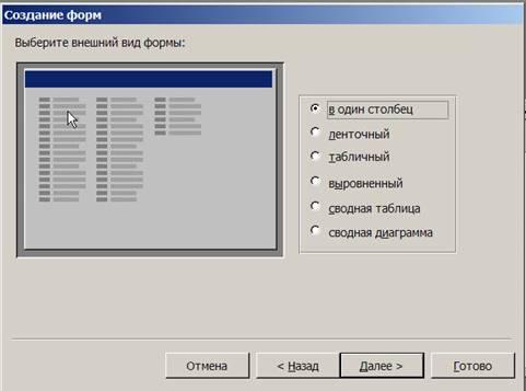 На следующих шагах Мастер форм предлагает выбрать форму представления отчета (в столбец, ленточную, табличную или выровненную) и стиль оформления (рис. 17).
