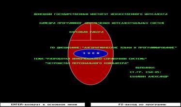 outtextxy(120,260,'ТЕМА:"РАЗРОБОТКА ИНФОРМАЦИОННОЙ СИСТЕМЫ"');