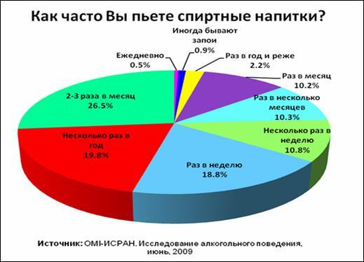 В июне 2009 компанией «Online Market Intelligence» совместно с Сектором девиантного поведения Института социологии РАН было проведено «онлайн» исследование о потреблении алкоголя россиянами, в котором приняли участие 611 респондентов.