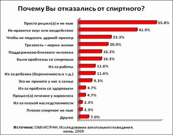 Большинство респондентов (55,8%) на вопрос «Почему вы отказались от употребления алкоголя» ответили «просто решил/решила, и не пью»; 41,9% не нравится вкус или воздействие алкоголя. Чуть менее четверти опрошенных (23,3%) не хотят подавать дурной пример детям, а 20,9% - считают трезвость нормой жизни, обязательной для всех. Интересно, что 16,3% респондентов отказались от спиртного, так как поддерживают близкого человека, который не пьет. Проблемы со здоровьем выглядят на этом фоне практически незначимыми: по этой причине бросили пить только 4,7% респондентов.[8]