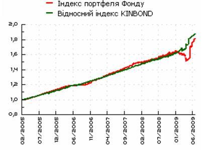 Отже, станом на перший квартал 2009 року динаміка ВЧА/акцію у порівнянні з еталоном (індекс KINBOND) мала наступний вигляд (мал. 9):
