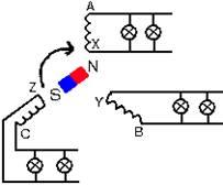 Поддержание постоянного сдвига по фазе между колебаниями напряжений на выходе трёх независимых генераторов является довольно сложной технической задачей. На практике для получения трёх токов, сдвинутых по фазе, используются трехфазные генераторы. Индуктором в генераторе служит электромагнит, обмотка которого питается постоянным током. Индуктор является ротором, а якорь генератора—статором. Каждая обмотка генератора является самостоятельным генератором тока. Присоединив провода к концам каждой из них, как это показано на рисунке, мы получили бы три независимые цепи, каждая из которых могла бы питать энергией те или иные приемники, например электрические лампы. В этом случае для передачи всей энергии, которую поглощают приемники, требовалось бы шесть