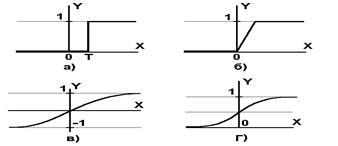 Рисунок 2 - а) функция единичного скачка; б) линейный порог (гистерезис); в) гиперболический тангенс; г) сигмоид