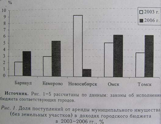 Проведенный анализ местных бюджетов показал, что в последние годы доля поступлений от аренды в доходах городских бюджетов имеет тенденцию к росту: так рост за 2003-2006 годы составил в среднем 1,5 раза, если исключить Новосибирск. Данный вид бюджетных доходов увеличился не столь высокими темпами, как земельный налог.