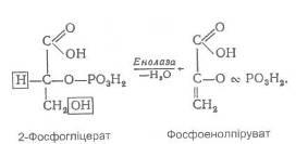 втрачає молекулу води, перетворюється у фосфоенолпіруват. Це друга реакція в процесі гліколізу, у результаті якої утворюється високоенергетичний зв'язок. Відщеплення молекули води – це внутрішньомолекулярний окисно-відновний процес, що супроводжується перерозподілом енергії всередині молекули.