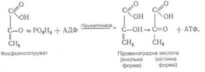 залишок активованої фосфатної кислоти переноситься від фосфоенолпірувату на АДФ з утворенням АТФ і піровиноградної кислоти, тобто здійснюється друга реакція фосфорилювання АДФ на рівні субстрату: