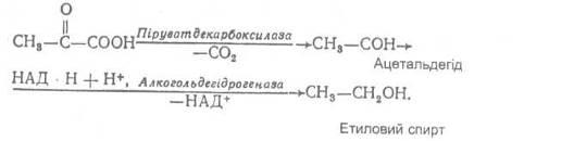 Виняток становлять тільки останні дві реакції: піровиноградна кислота під дією піруватдекарбоксилази перетворюється в оцтовий альдегід, який під впливом відновленого коферменту НАД • Н + Н+