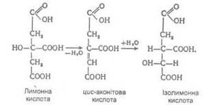 перетворюється в цис-аконітову кислоту, яка, приєднуючи воду, перетворюється в ізолимонну кислоту: