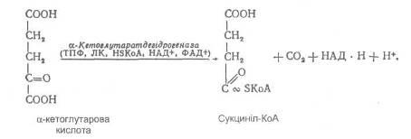 Наступним етапом циклу трикарбонових кислот є реакція окислювального декарбоксилювання α-кетоглутарової кислоти, у результаті якої утворюється янтарна кислота. Цей процес здійснюється у дві стадії. Перша стадія: