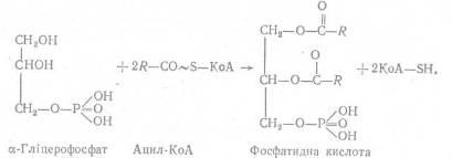 Біосинтез вищих жирних кислот, необхідних для синтезу ліпідів, здійснюється за участю центрального метаболіту вуглеводного обміну – піровиноградної кислоти, в результаті окислювального декарбоксилування її і утворення активного ацетату – ацетил-КоА. Ацетил-КоА вступає у реакцію конденсації, внаслідок чого утворюється ацетооцтова кислота, з якої далі синтезуються одноосновні високомолекулярні кетокислоти, які беруть участь в утворенні жирних кислот.