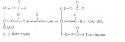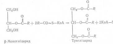 – характерний в основному для слизової оболонки кишок. Він здійснюється шляхом взаємодії β-моногліцериду з двома молекулами ацил-КоА. При цьому утворюється відповідний тригліцерид. Реакцію каталізує фермент дигліцерид-трансацилаза: