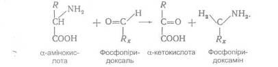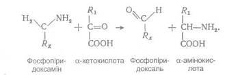 -групи від амінокислоти на фосфопіридоксаль амінотрансферази. При цьому амінокислота перетворюється у відповідну кетокислоту, а фосфопіридоксаль у фосфопіридоксамін: