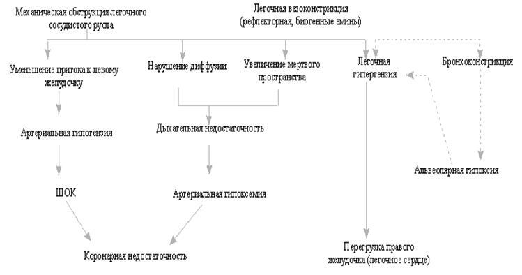 Гемодинамические нарушения возникают вследствие того, что уменьшение емкости сосудистого русла малого круга из-за тромбоэмболии приводит к повышению сосудистого сопротивления, развитию легочной гипертензии и острого легочного сердца. Следствием развивающейся при этом острой правожелудочковой декомпенсации является уменьшение сердечного выброса левым желудочком, что ведет к резкому повышению общего периферического сосудистого сопротивления в большом круге и выраженной тахикардии.